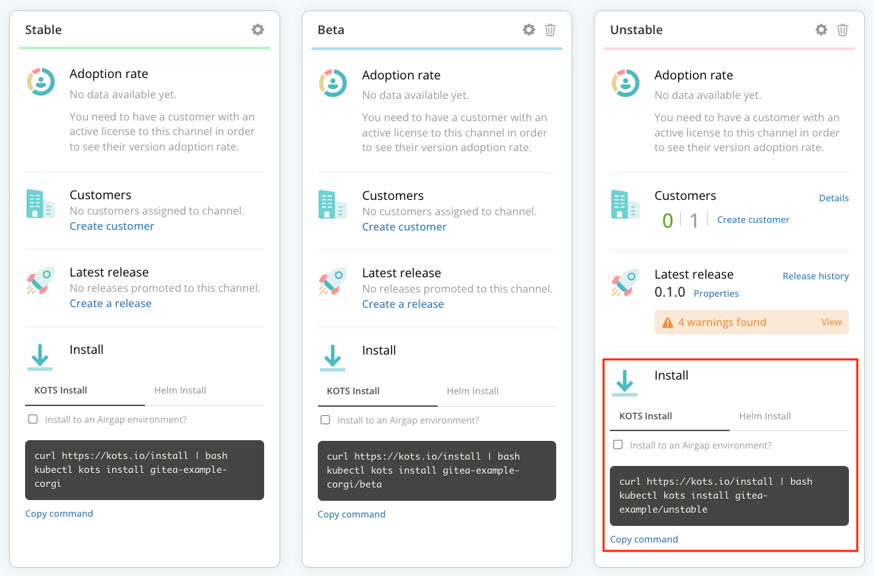 In the Vendor Portal, go to Channels. From the Unstable channel card, under Install, copy the KOTS Install command.